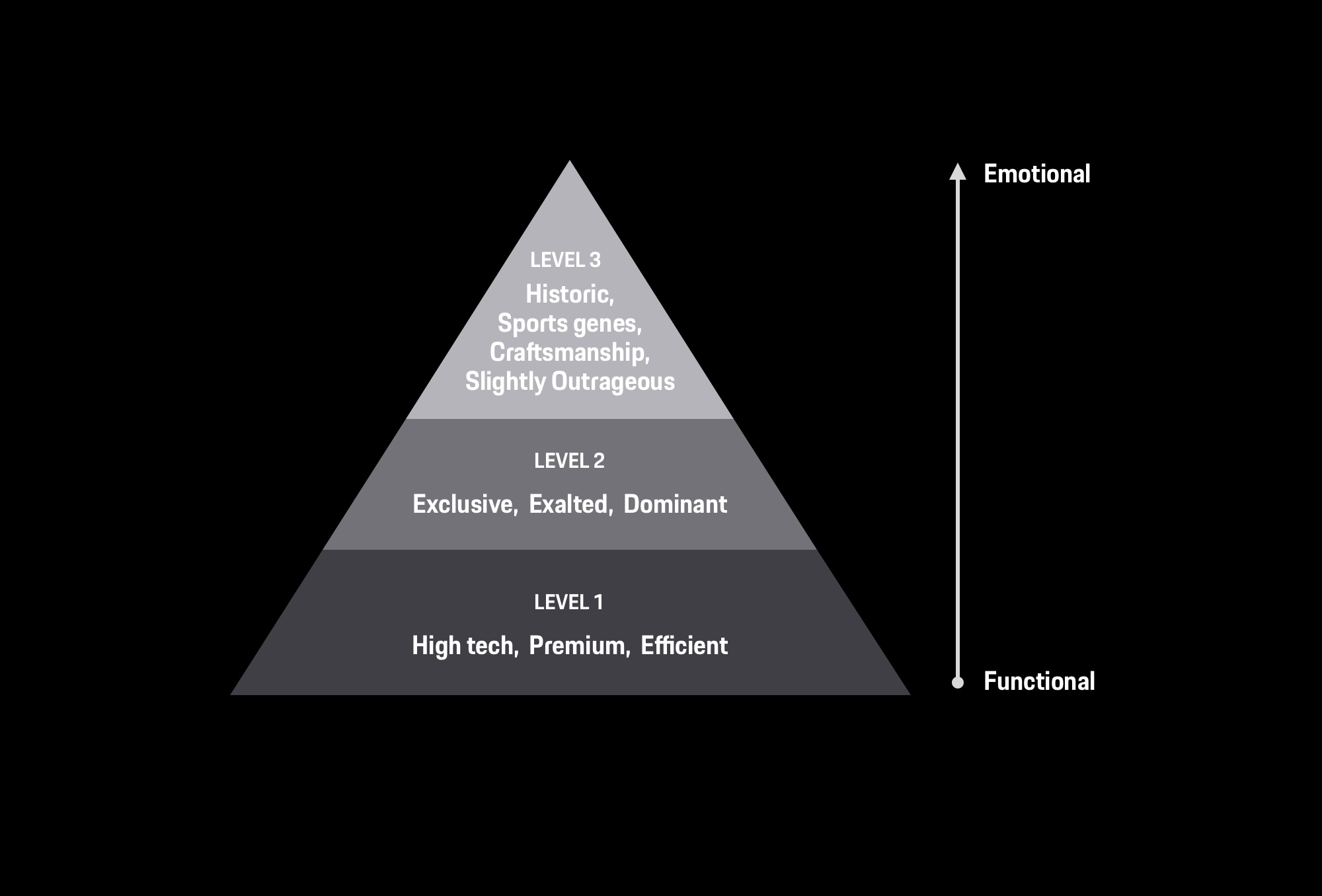 将关键词(Sport genes 赛道基因、Exclusive 专享、Exalted 尊贵、High tech 科技和 Premium 高级)整理成视觉表达的层级与比重并将其和 Porsche design values 对齐,以此作为视觉设计的标准: