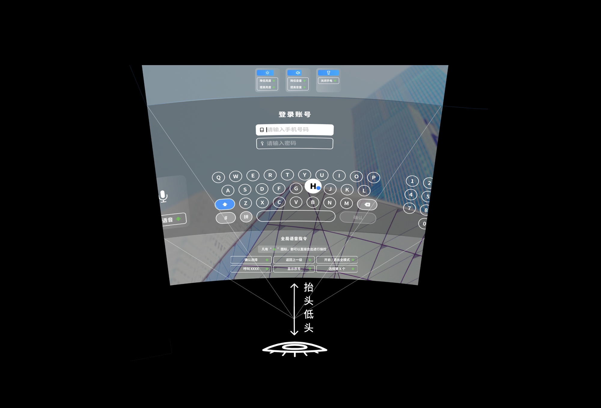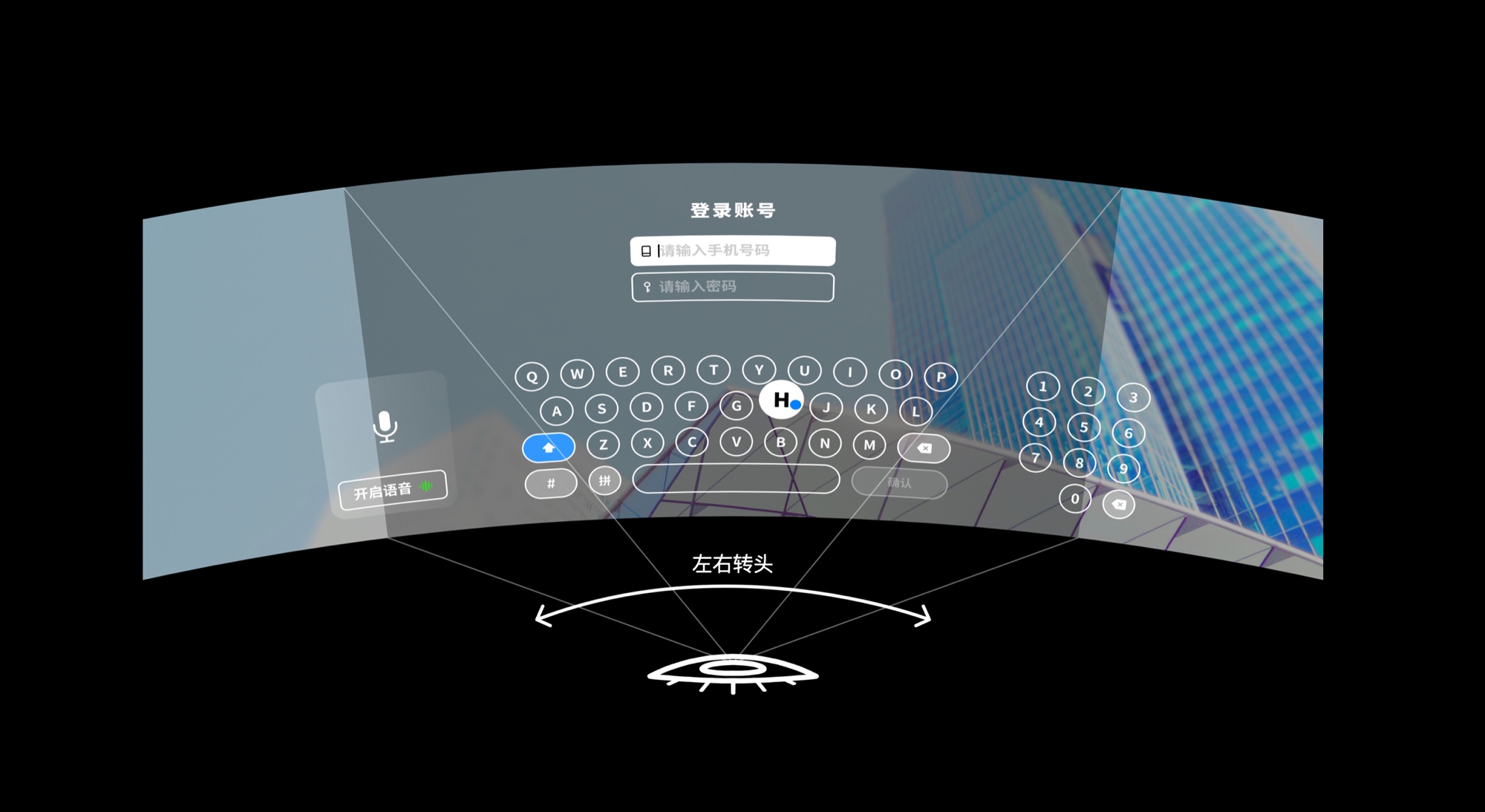 回到输入法,我们其中一个方案即利用了 AR 的无限空间特性,我们选择不挑战传统的键盘布局,既然 AR 提供无限的空间,那之前需要切换的字母键盘、数字键盘和语音输入不就可以同时共存了?只需保证用户可以快速便捷的在三种输入方式之间进行切换即可,用户可以左右转头,切换使用的输入方式。