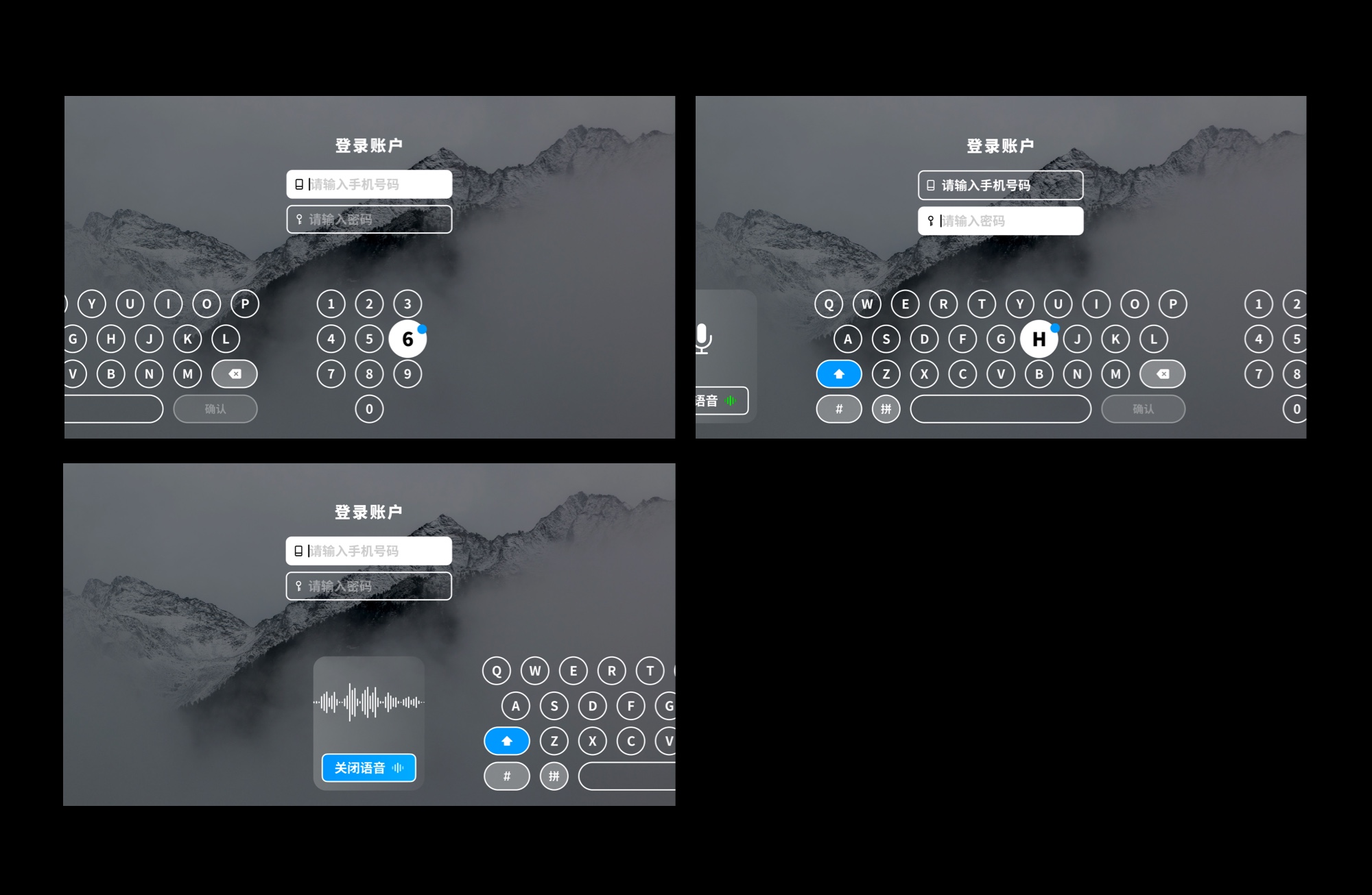 大部分输入都可以通过选择来完成,如选择操作,选择账号等,可以通过语音、凝视点或按键完成,但有些情况下必需要用到精确输入,如输入密码等,此时,我们就需要有一个应对精确输入的输入法方案。