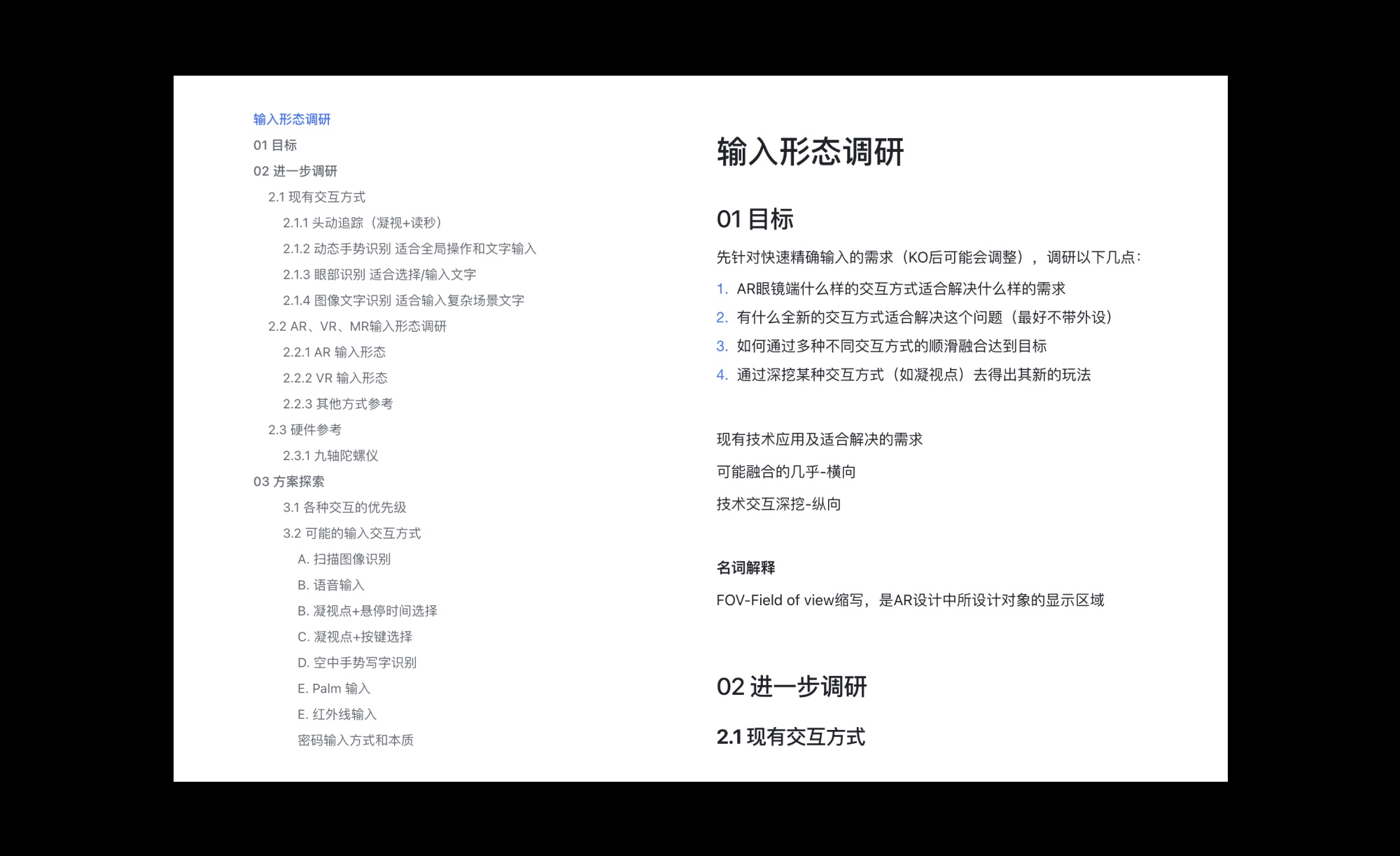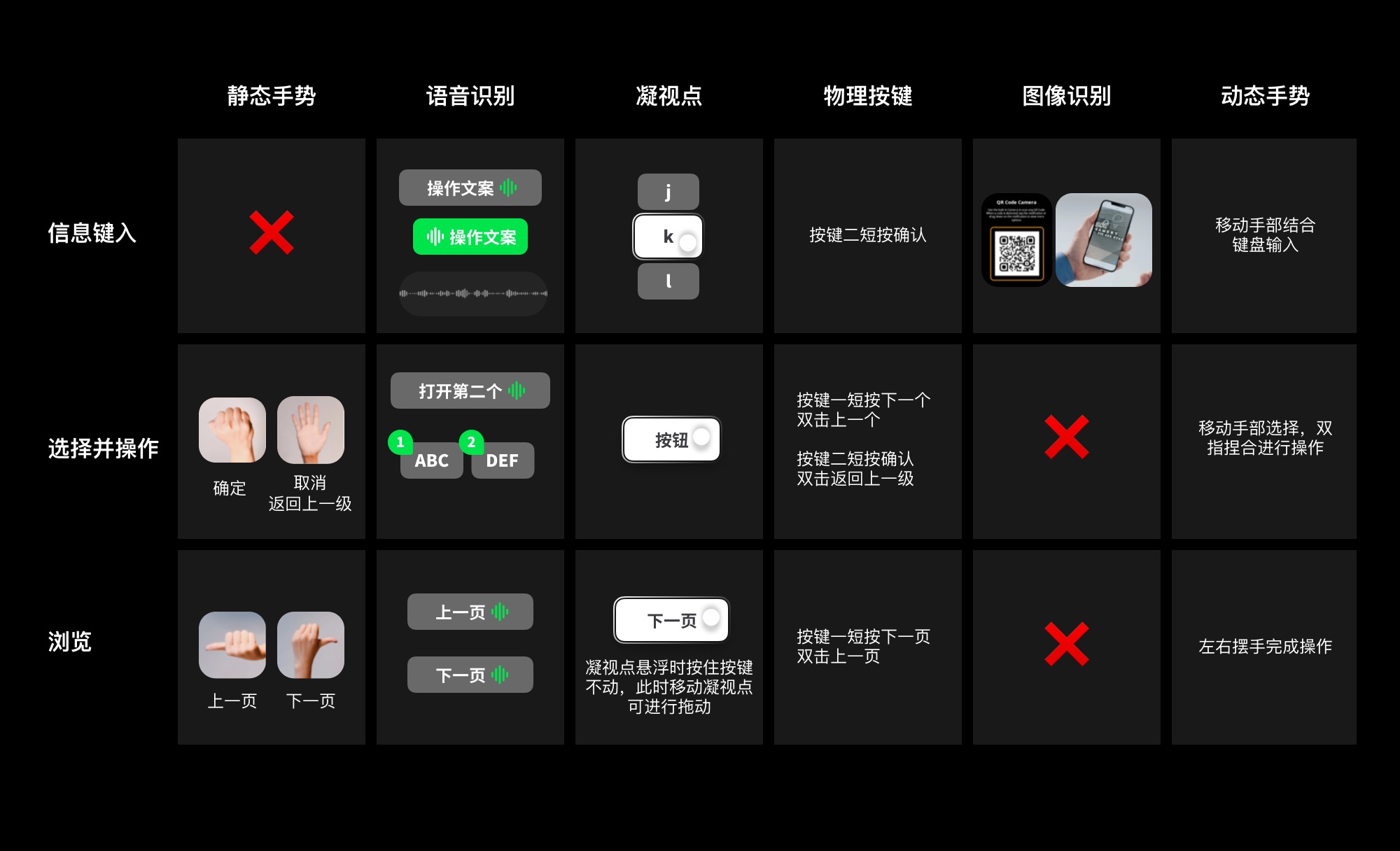 我们调研了市面上现有的输入方式(静态手势、语音识别、凝视点、物理按键、图像识别和动态手势),对其能完成的操作做了统计。